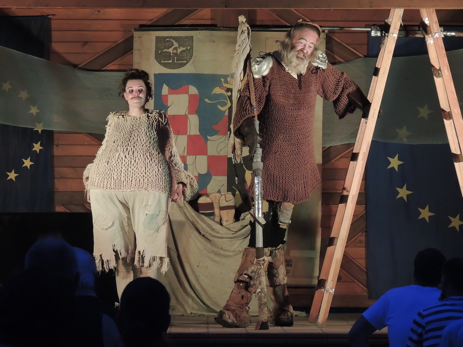 První srpnový pátek zavítalo do naší obce Divadlo Klauniky Brno se svou populární inscenací Don Quijote de la mAncha. Tuto autorskou inscenaci má divadlo ve svém repertoáru již od roku 1988 a jedná se o jedno z nejhranějších evropských představení, které vzniklo pod režijním vedením známého českého klauna Bolka Polívky a dočkalo se za svou existenci již více jak 4 000 repríz. Inscenare rovněž získala u nás i v zahraničí řadu ocenění, byla přeložena do pěti světových jazyků a umělci s ní hostovali v mnohých evropských zemích. Tato hra vznikla na motivy rytířského románu ze 17.století Miguela Cervantese Saavedry o svérázném rytíři Donu Quijotovi a jeho věrném služebníku Sancho Panzovi. V pojetí Divadla Klauniky jsou však hlavními hrdiny 2,38 m vysoký profesor španělského jazyka a literatury a 120-ti kilová Ancha, pracující jako vychovatelka na kominickém internátě ve Šlapanicích. Celé dílo je pojato jako didaktická klaunikyáda, kde jsou přímo do děje vtahováni samotní diváci. Nejinak tomu bylo i u nás, a tak se řada diváků dostala přímo do děje hry, které nechybí humor, nadsázka, spontánnost a hravost. Podle reakcí publika se tato inscenace velmi líbila a také účast byla velmi hojná a tuto inscenaci zhlédly v Hradčanech na tři stovky spokojených diváků.