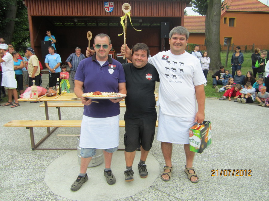 V soboru 21.července pořádala obec Skalička, se kterou máme velmi dobré vztahy, soutěž o Zlatou vařečku ve vaření kotlíkového guláše. Hradčany do tohoto soutěžního klání vyslaly dva týmy. Za ženy to byl tým ve složení Olga Zapletalová, Jana Koutná a Petra Skopalíková. Mužský tým jel do boje ve složení Jaromír Václavík, Zdeněk Brázda a Vladimír Zapletal ml. Museli si poradit s konkurencí dalších 18 družstev, která se do Skaličky sjela z různých koutů regionu, aby předvedla své kulinářské umění. Vařily se guláše mexické, zajícové, vepřové, formanské, hovězí nebo třeba také medové či kančí. Každý maximálně tříčlenný tým měl 4 hodiny čistého času na vaření a poté musel svůj guláš předložit 5-ti členné porotě k posouzení. Náš ženský tým nazval svůj výtvor HRGUL. Jistě netřeba vysvětlovat, jak toto slovo vzniklo, když se jednalo o pravý HRadčanský GULáš. Jak nám samy kuchařky prozradily, vařily klasický hovězí guláš bez nějakých exotických přísad. Vsadily tedy na klasiku a ta se jim vyplatila, neboť se ve velké konkurenci staly hrdými majitelkami Zlaté vařečky. Za toto vítězství si tak kromě samotné vařečky zaslouženě odnášely od porotců litr domácí slivovice a velkou uzenou kýtu. Pozadu nezůstal ani náš mužský tým, který obsadil krásné 3.místo se svou specialitou nazvanou „Starostův guláš“. Jak nám sami kuchaři prozradili, tajnou ingrediencí v jejich guláši byly houby – václavky. Za toto umístění si odnesli obloženou mísu a karton piva. Jménem obecního úřadu jim děkujeme za vzornou reprezentaci obce a k jejich krásnému umístění jim gratulujeme !
