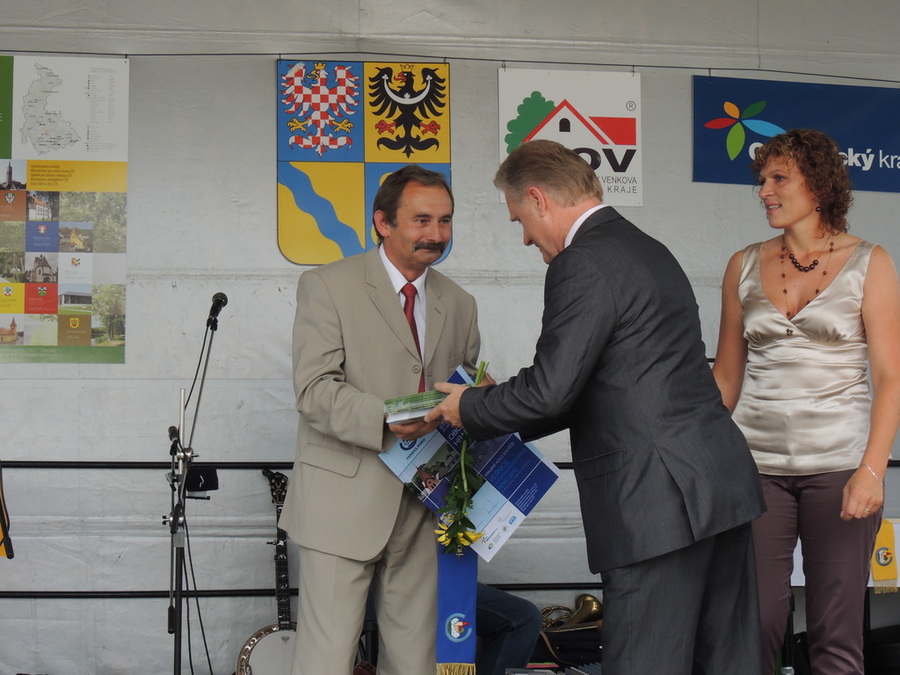 V pátek 27.července se v Radslavicích konalo vyhlašování výsledků letošního kola soutěže Vesnice roku Olomouckého kraje 2012. Z naší obce byl vyslán osmičlenný tým složený ze zástupců místních spolků a obecního úřadu. Nejprve jsme v Radslavicích využili možnosti svést se po obci zapůjčeným „tučolínem“, kde nám průvodkyní byla sl.Martina Trumberová, místní kronikářka, která měla vskutku široké znalosti o historii obce a ty nám také v kostce během 20-ti minutové projížďky vsí předala. Pak už následovalo vystoupení místních občanů, které zahrnovalo cvičení maminek s dětmi, zumbu v podání místních žen, taneční číslo zdejší úspěšné gymnastky a na závěr vystoupení „tanečních jelit“ s názvem Los Afros, které sklidilo zasloužený aplaus. Pak již přišlo na řadu samotné vyhlášení výsledků. Jak jsme již samozřejmě předem věděli, naší výhrou byla Modrá stuha za společenský život a finanční dar ve výši 600.000 Kč, který musí obec použít na realizaci nějakého projektu. Co však pro nás bylo obrovským překvapením a šokem, byla výhra Zlaté cihly za stavbu kaple sv.A.Paduánského v kategorii „nové venkovské stavby“. Z Radslavic jsme si tak nečekaně odváželi ne jednu, ale hned dvě krásné výhry.